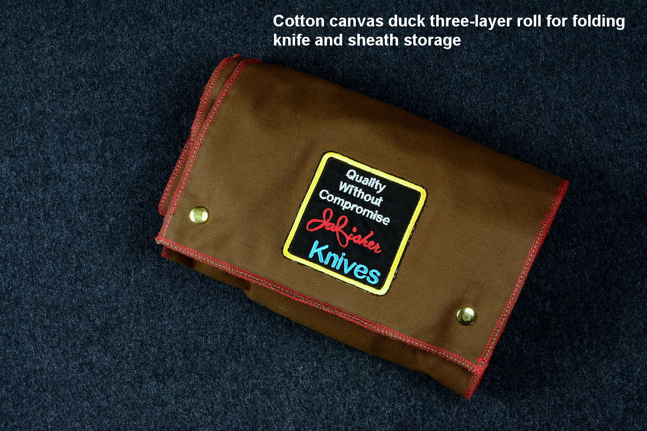 Storing the knife long term in the sheath is a bad idea , and can damage the sheath as well as the knife (see the previous topic). Some metallic components of the knife can react with the leather, and possibly (in the presence of moisture) stain the leather, perhaps permanently. This is another reason that most of my knives are currently made with 304 austenitic stainless steel fittings, to limit all types of corrosion. Woods and other organics: brass, nickel silver, horn, bone, ivories and plastics all can have reactions with leather when the knife is stored long term in the sheath. Some loosening of the leather knife sheath may also occur when the knife is stored in it for a long time. Don't, ever, store the knife in plastic; the knife and sheath need to breath. That's why my heavy cotton denim drawstring bag is a great idea, it's dry and breathable. Still, the surrounding environment needs to be dry and not damp.