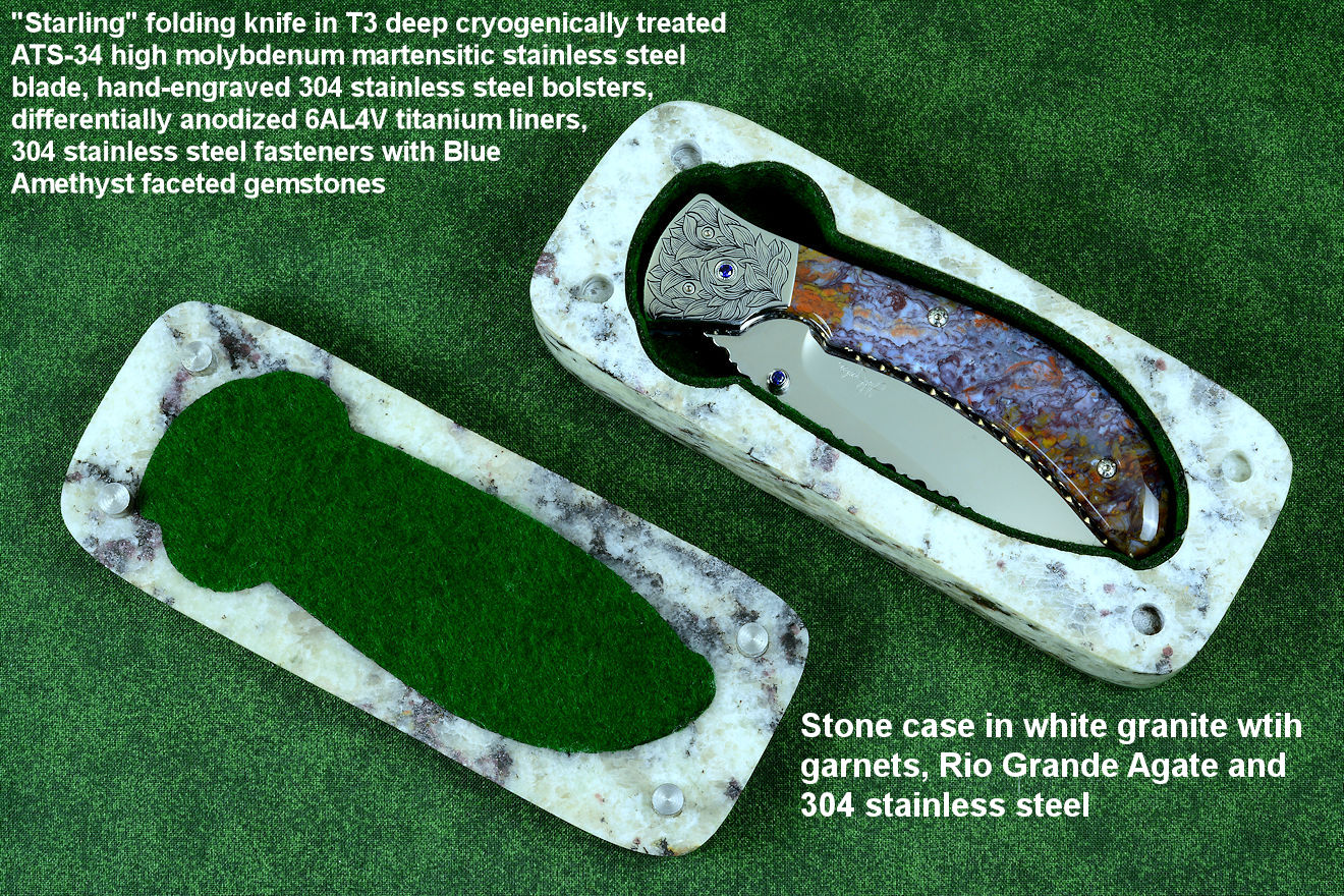 Many people do not realize what goes in to a fine sculptural stand, case, block, or presentation device. Carving, shaping, finishing and mechanics are all parts of the knife sculptural experience. Welding, carving in wax, casting metals, fitting stone, and other necessary skills are employed in the creation of the idea. A great deal of hand work and finishing is applied to bring the potential out of the rough materials used in the custom stand, case, or block. All of this takes a great deal of time.