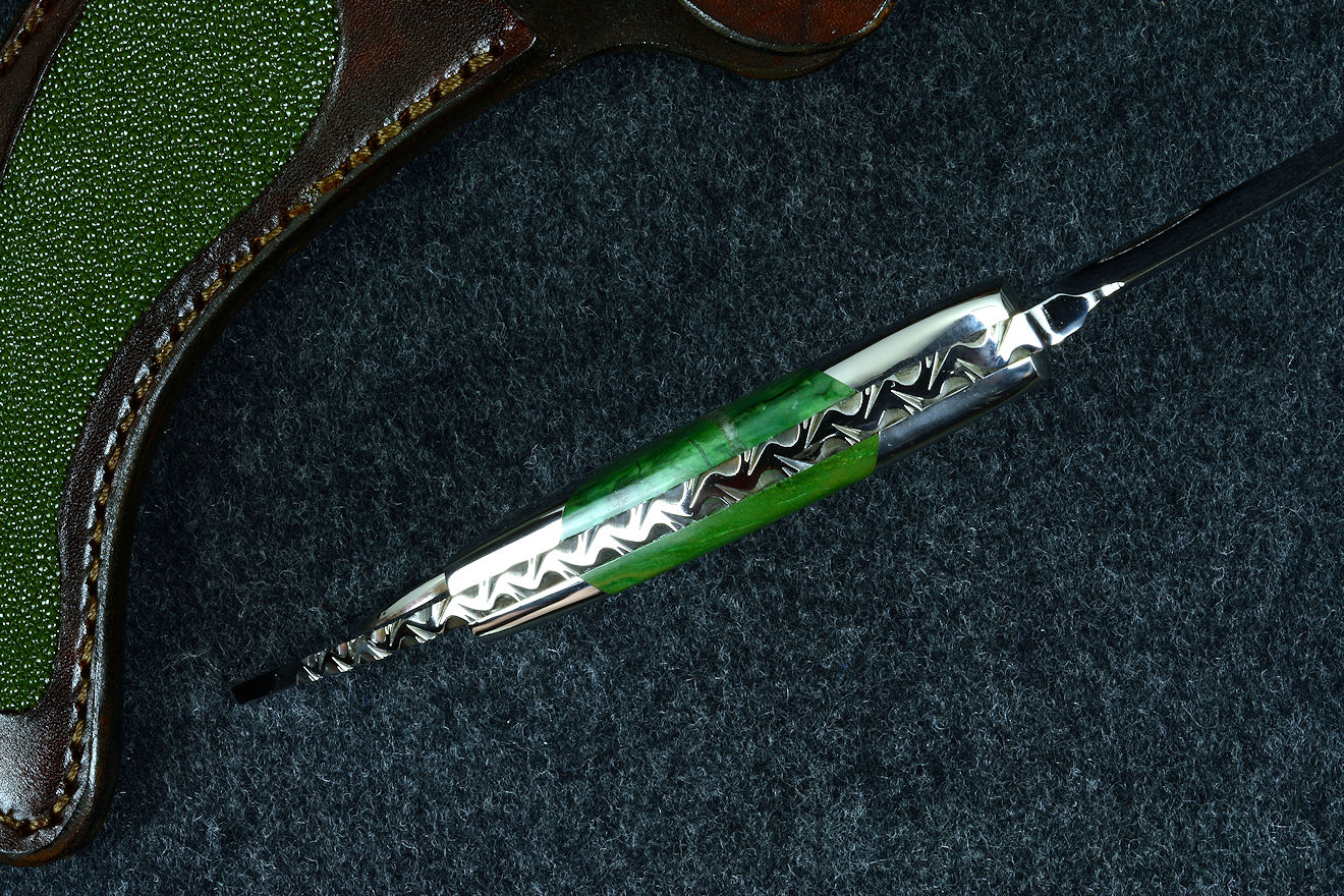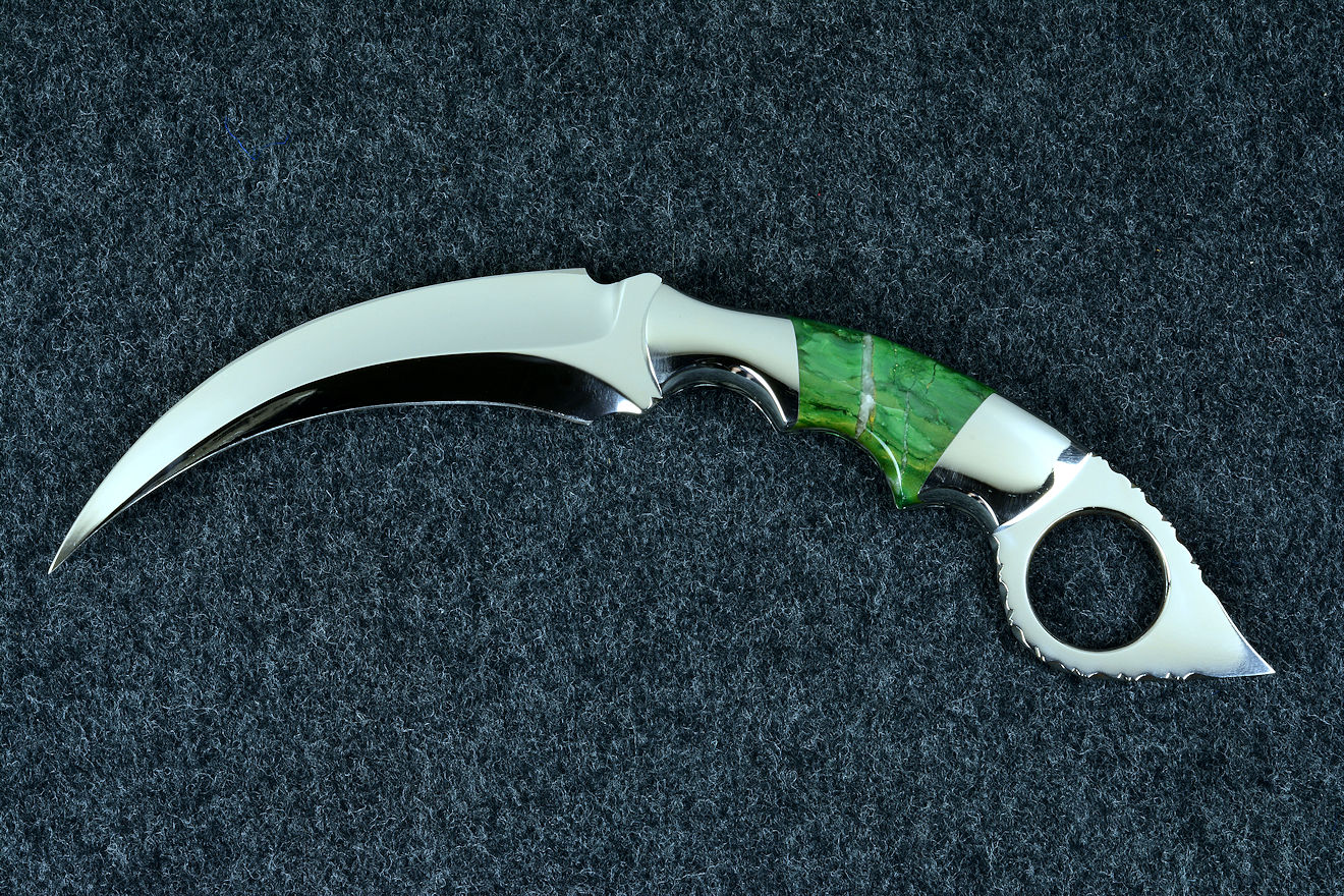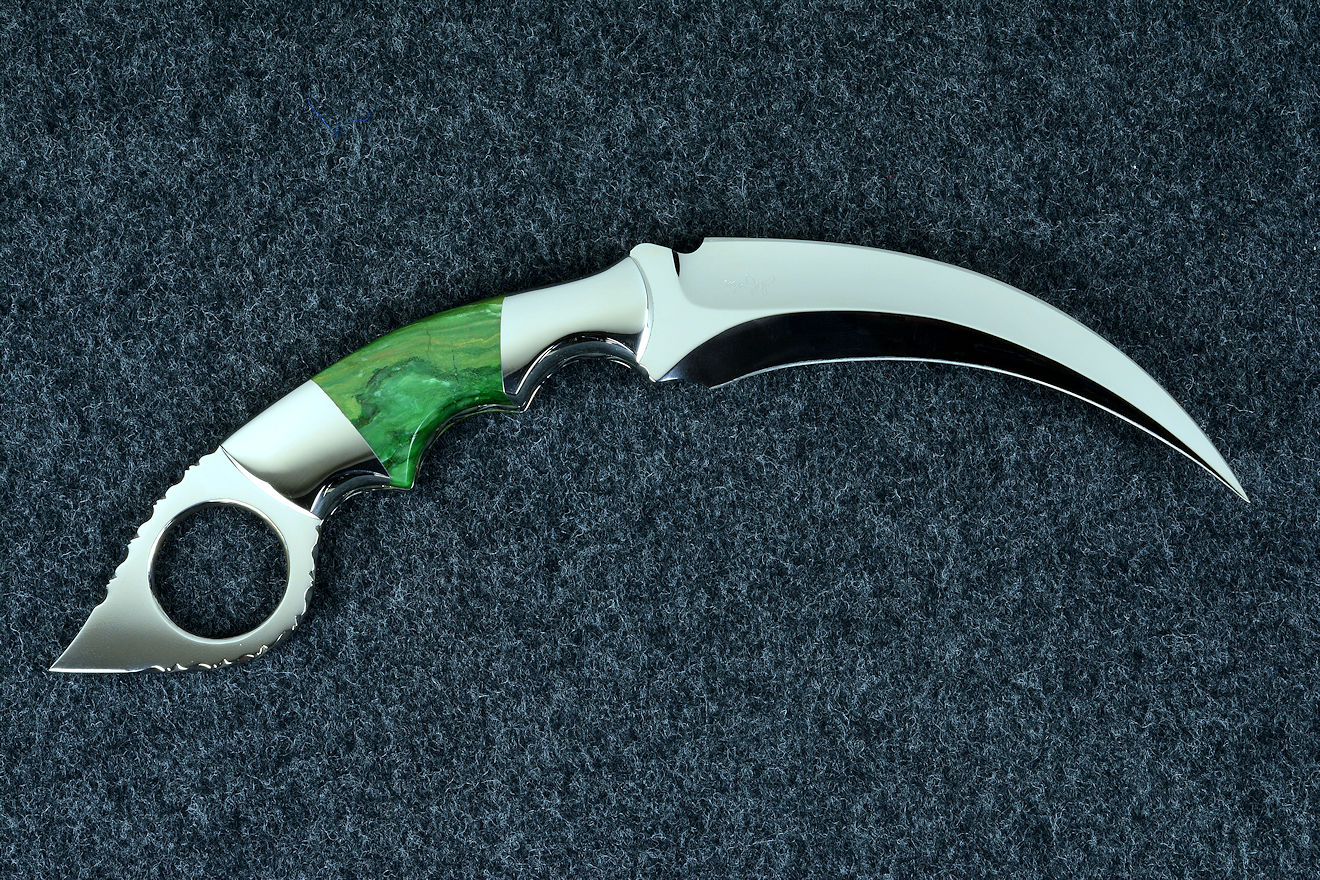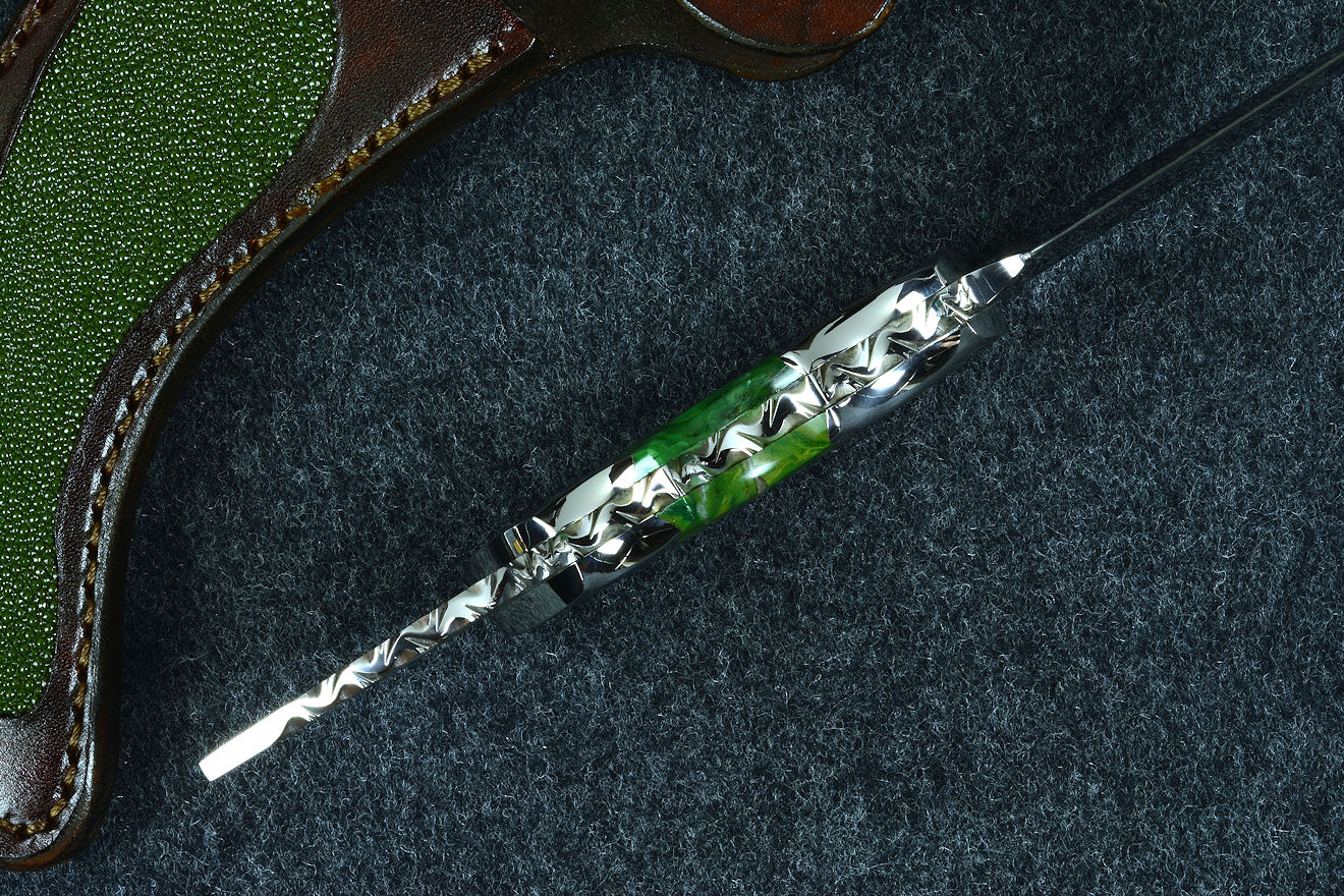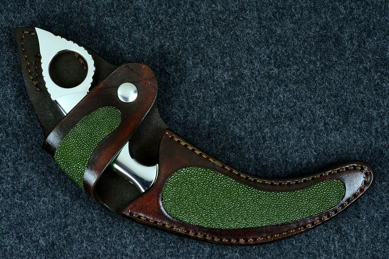 - Sheath: Hand-carved, hand-dyed leather shoulder inlaid with green rayskin, nylon stitching, stainless steel dot snap